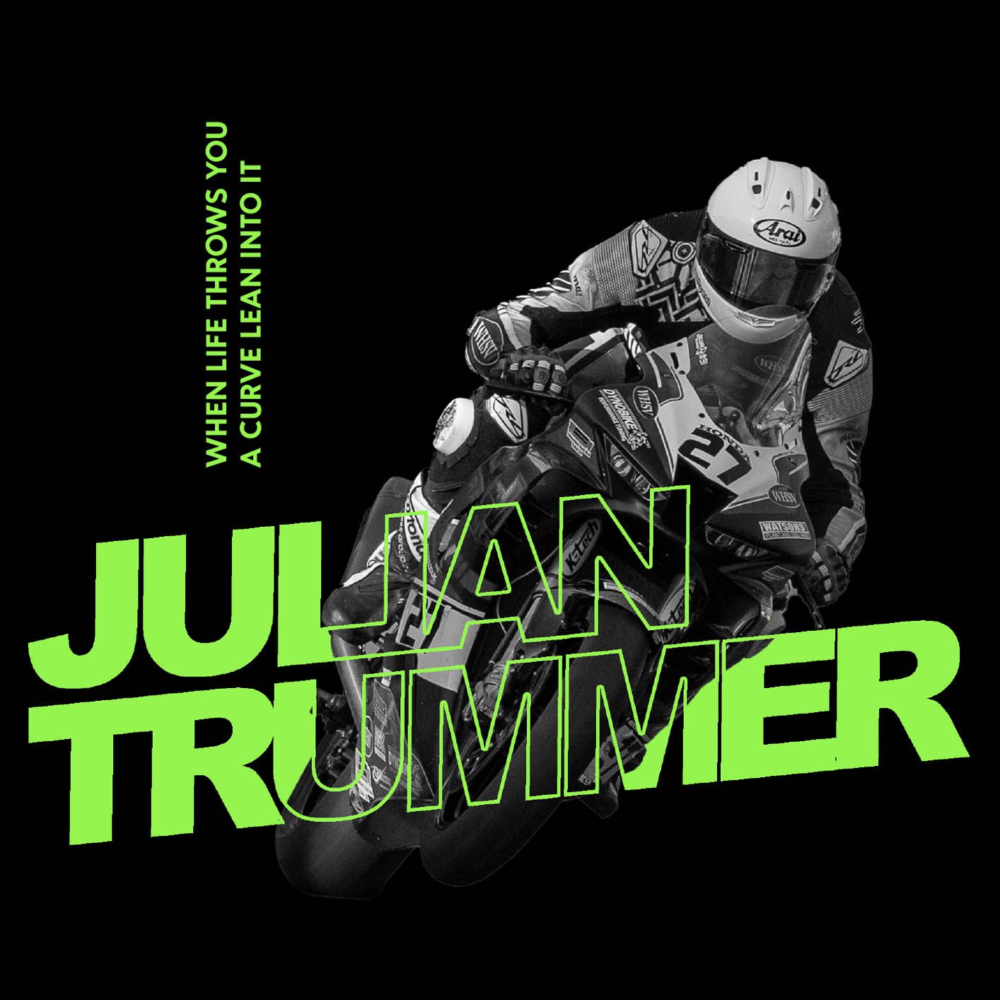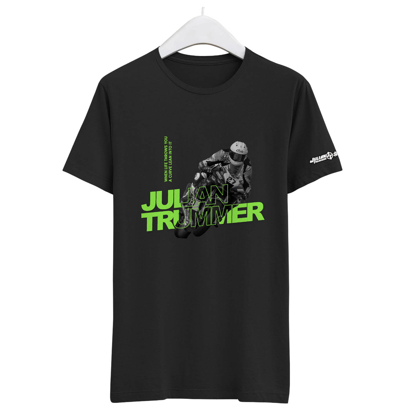 T-Shirt mit normaler Passform. Auf der Vorderseite eine Racing Action von Julian Trummer und der Spruch: FUCK THAT SHIT. Auf dem Ärmel das Julian Trummer 91-Logo.