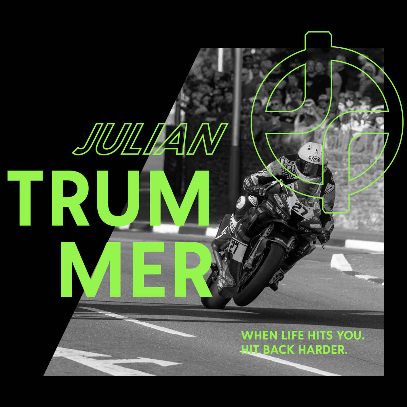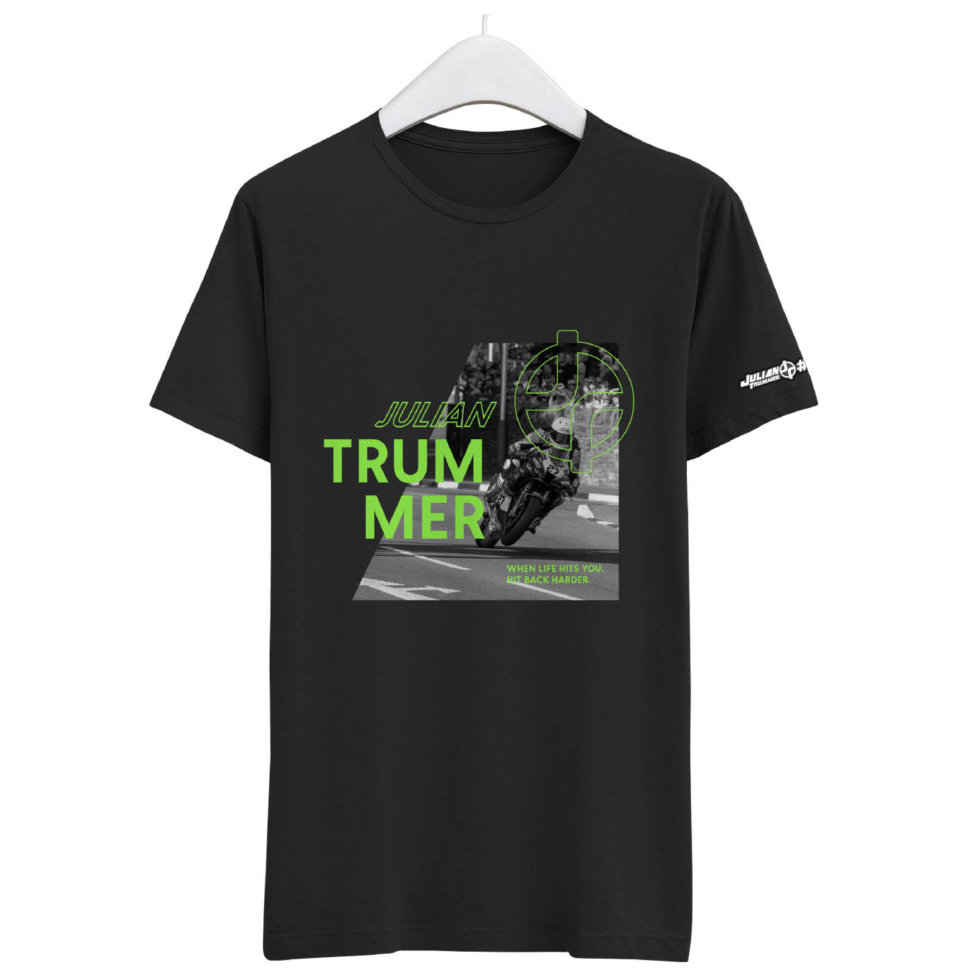 T-Shirt mit normaler Passform. Auf der Vorderseite Racing Action von Julian Trummer und der Spruch: WHEN LIFE HITS YOU – HIT BACK HARDER. Auf dem Ärmel das Julian Trummer 91-Logo.